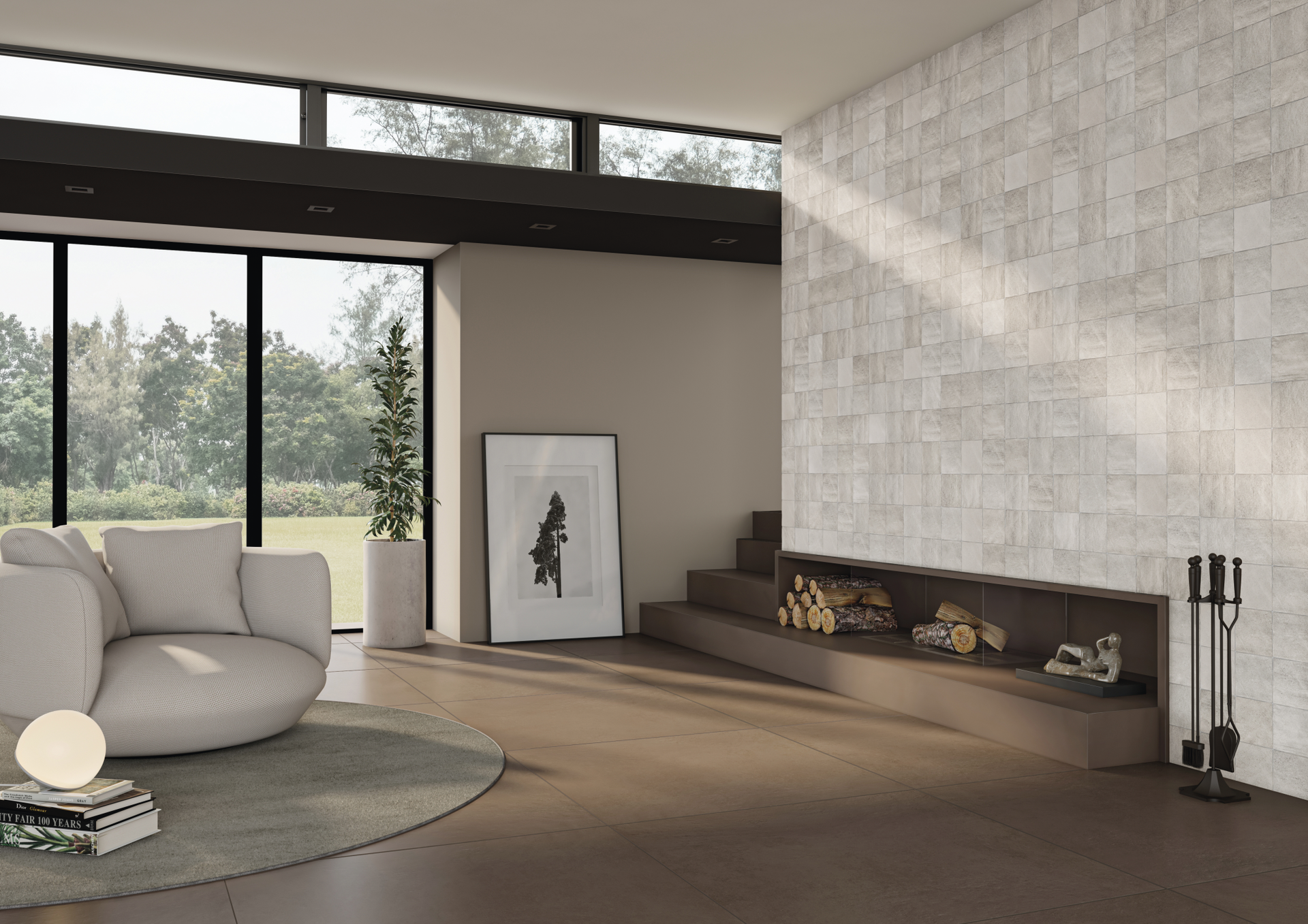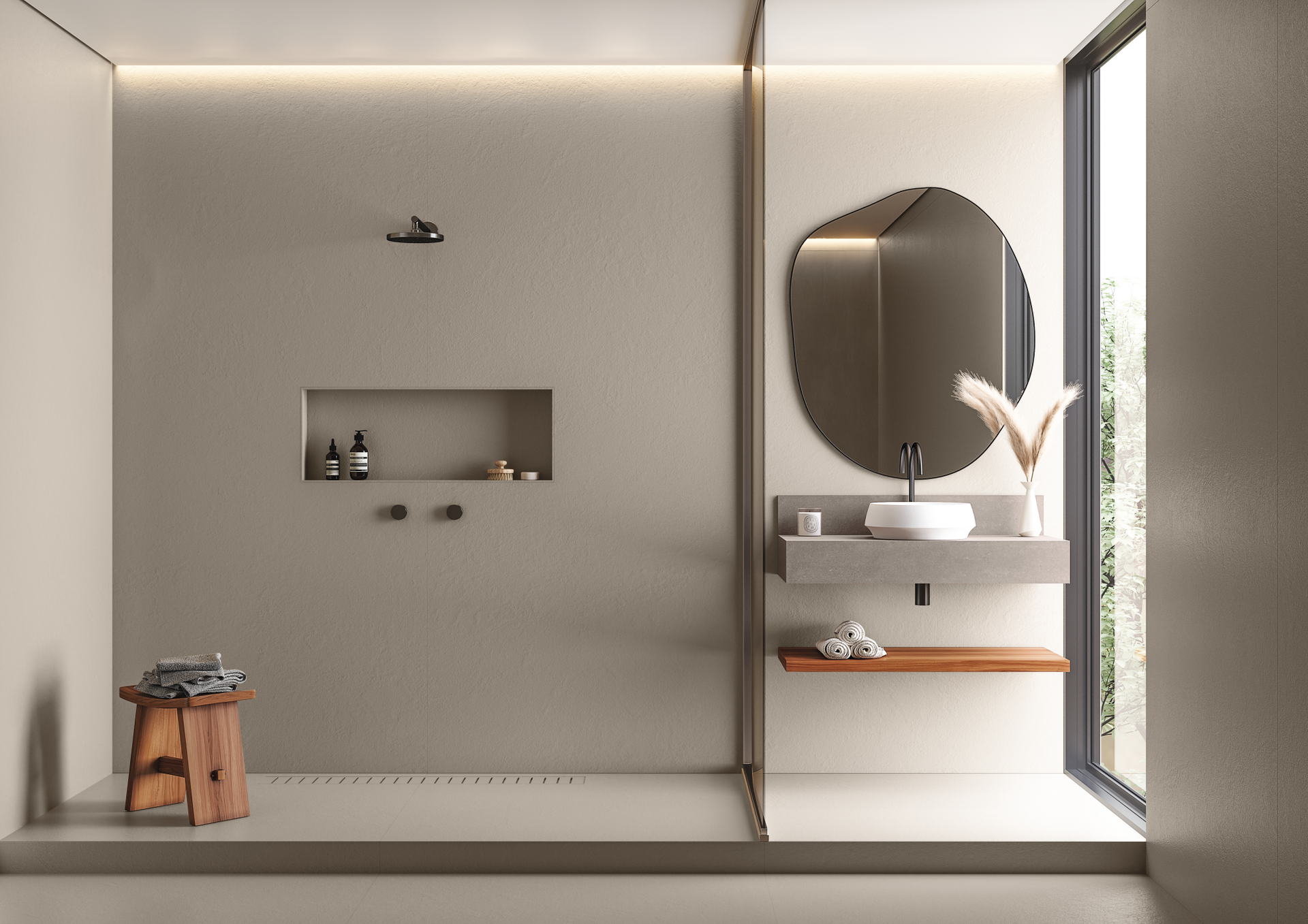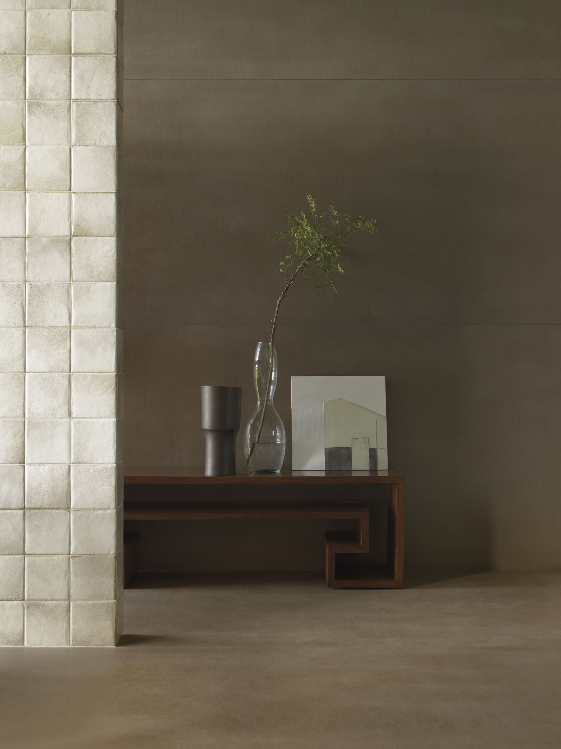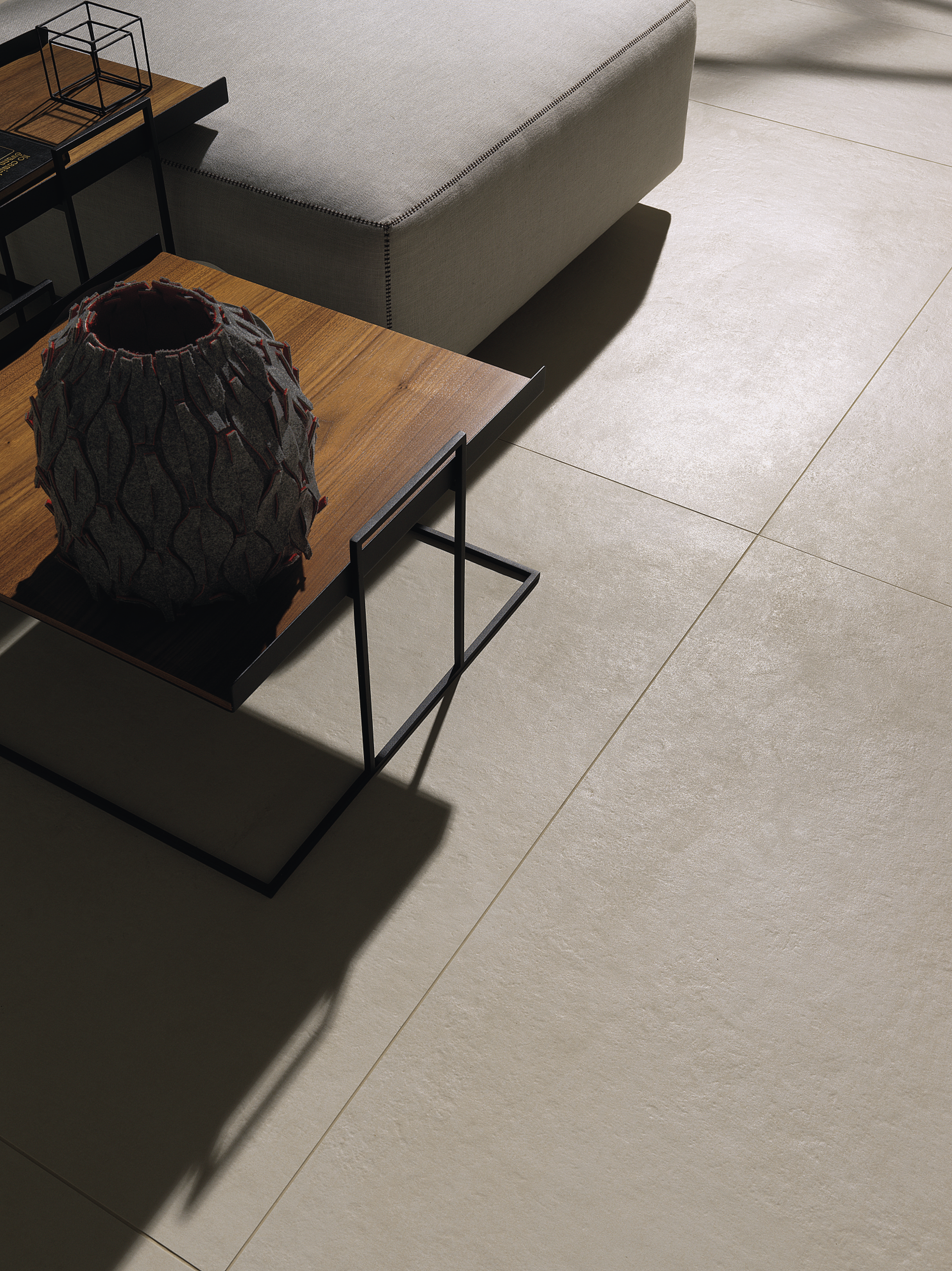 The reproduction of a minimalist and almost single colored cement surface in warm tones translates the search for the essential and the comfort in living spaces.