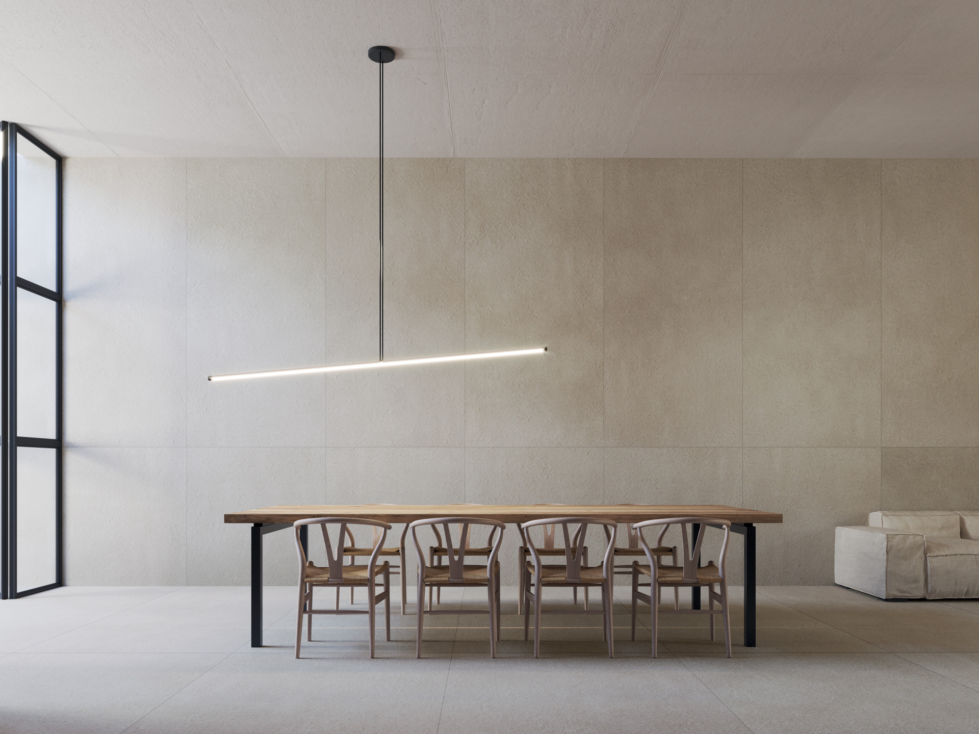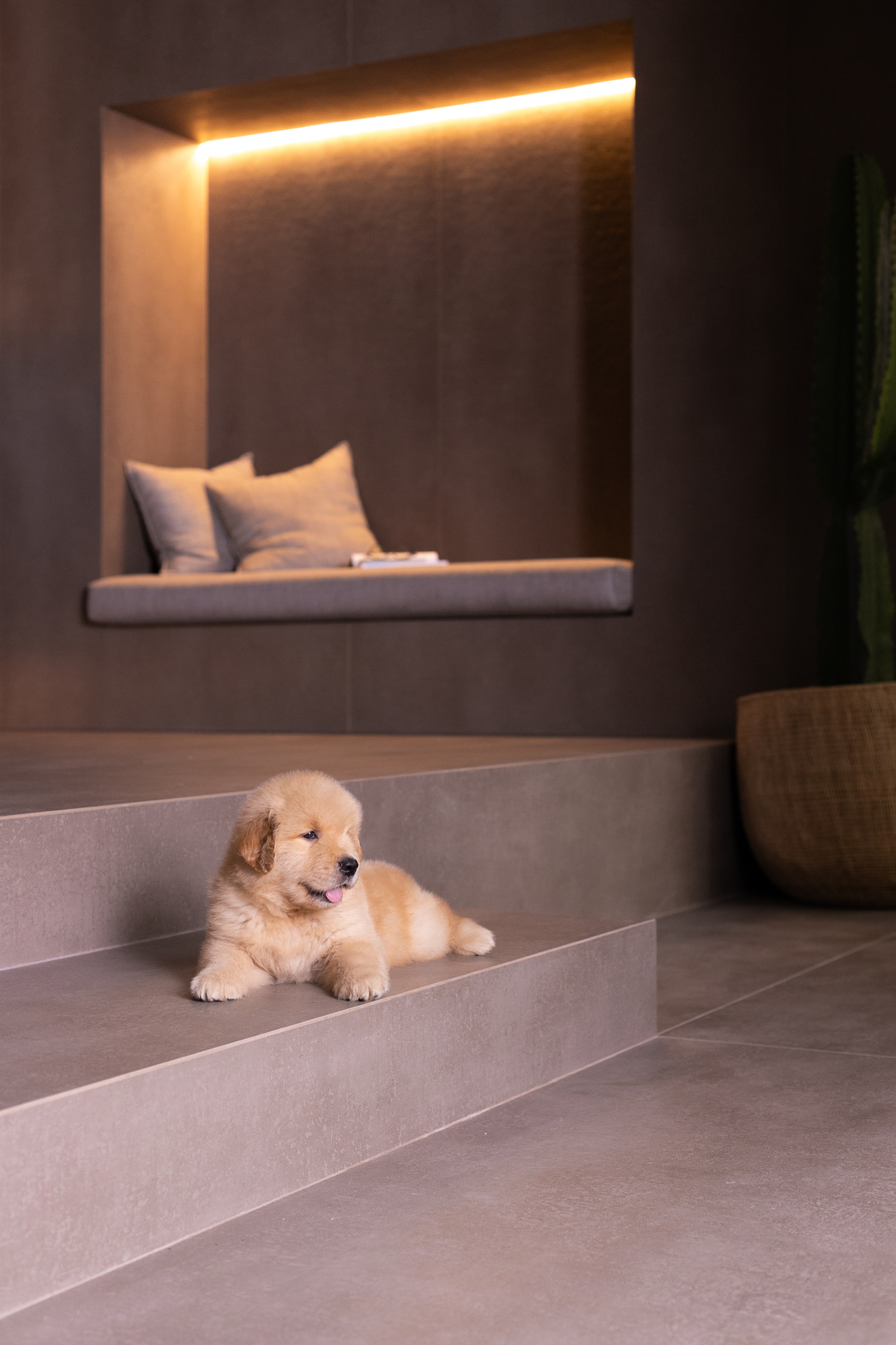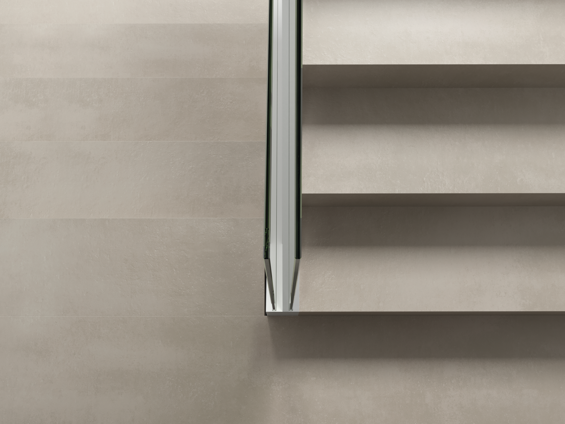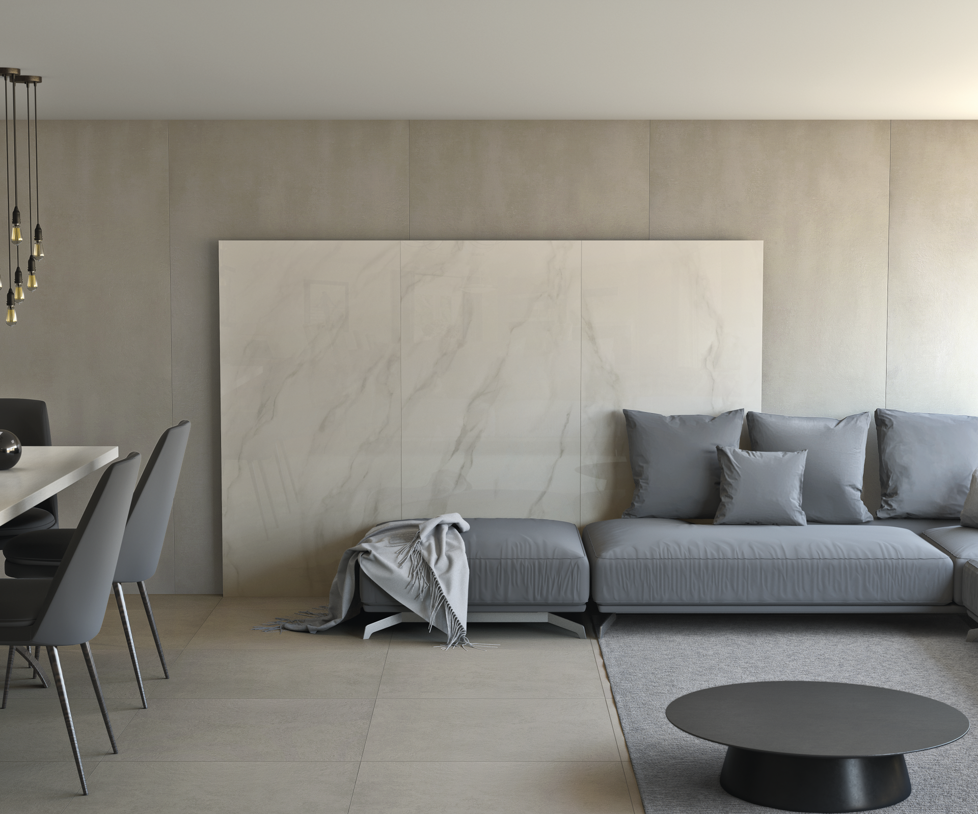 The reproduction of a minimalist and almost single colored cement surface in warm tones translates the search for the essential and the comfort in living spaces.