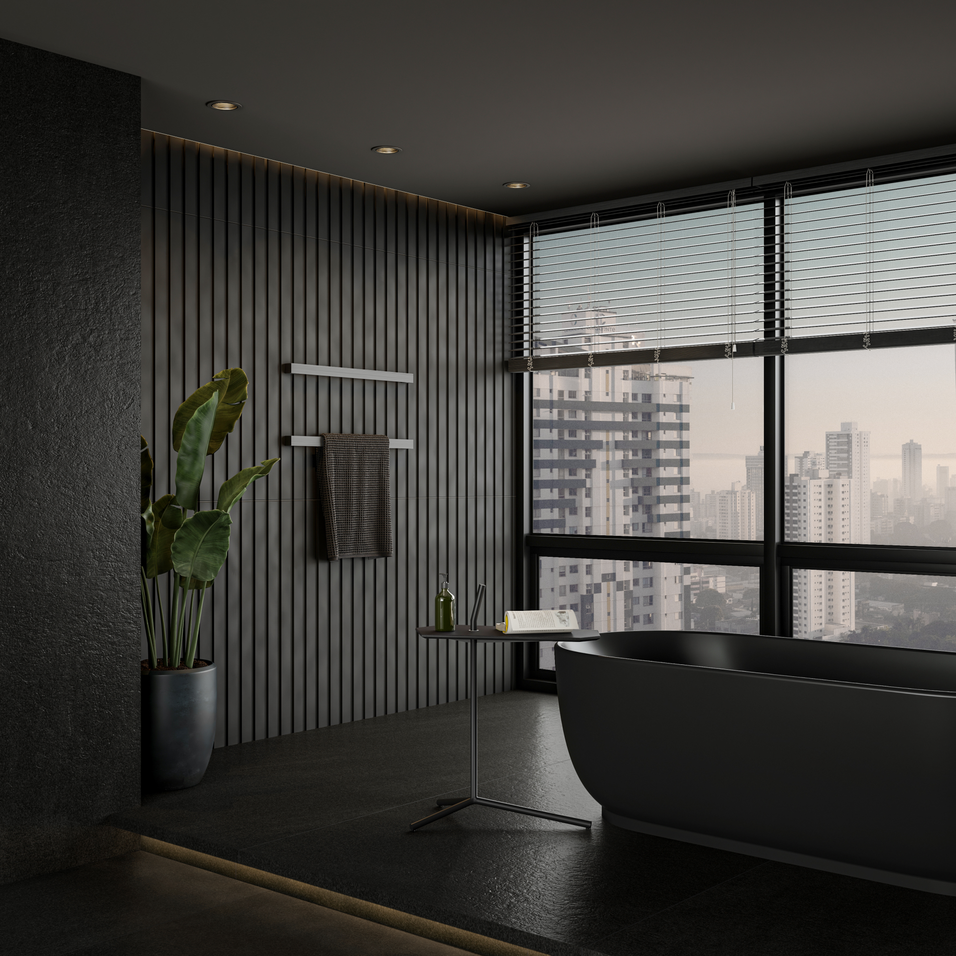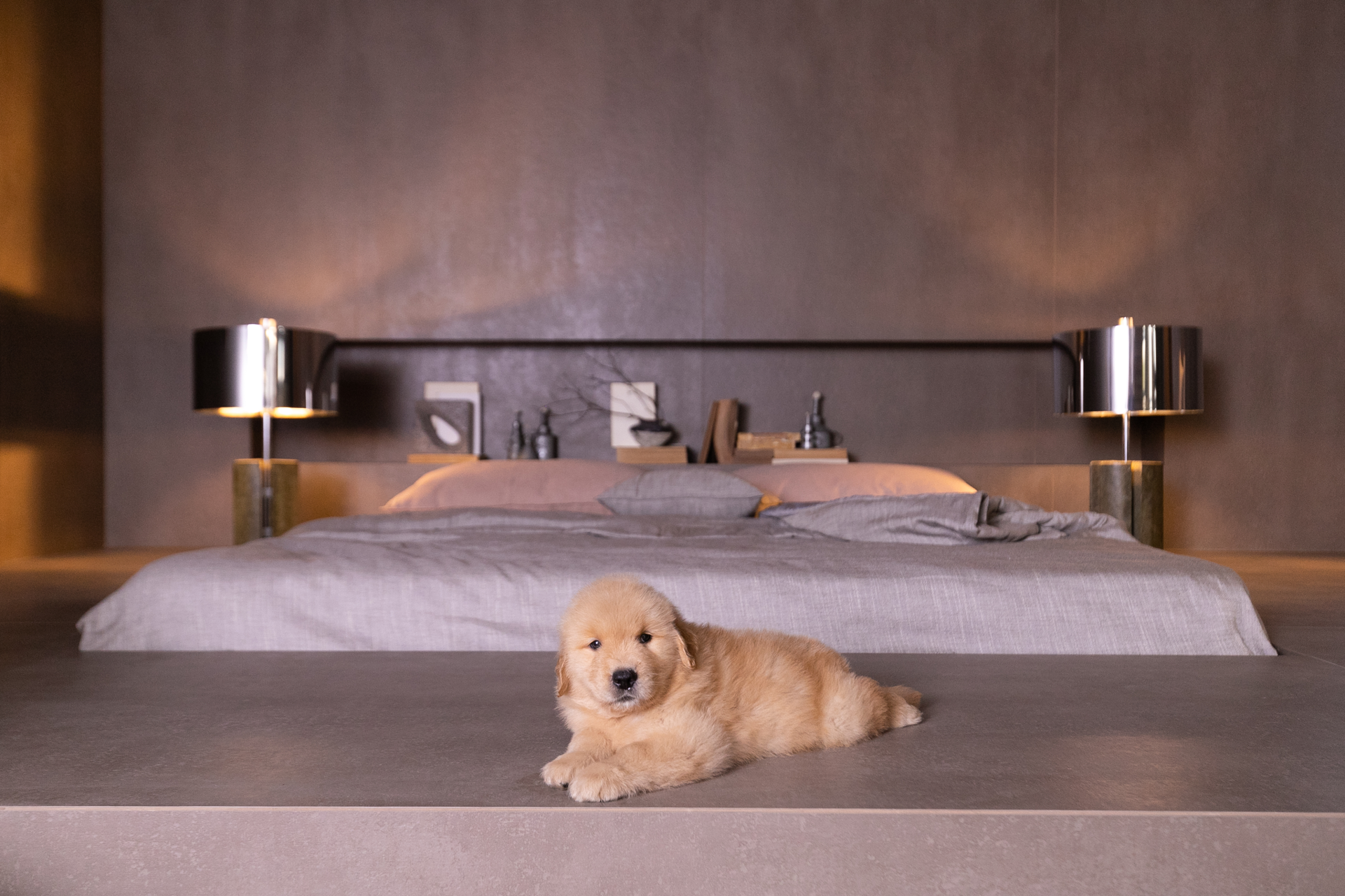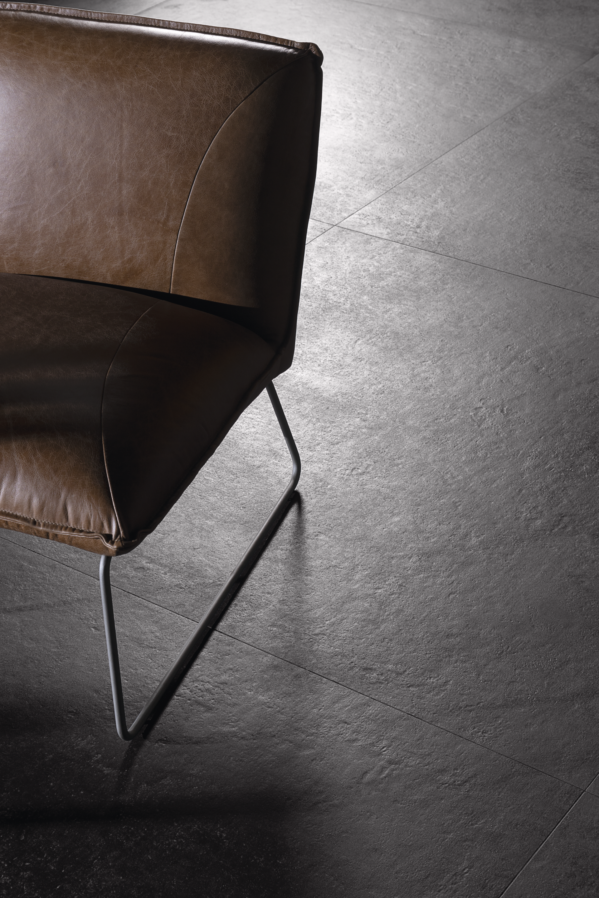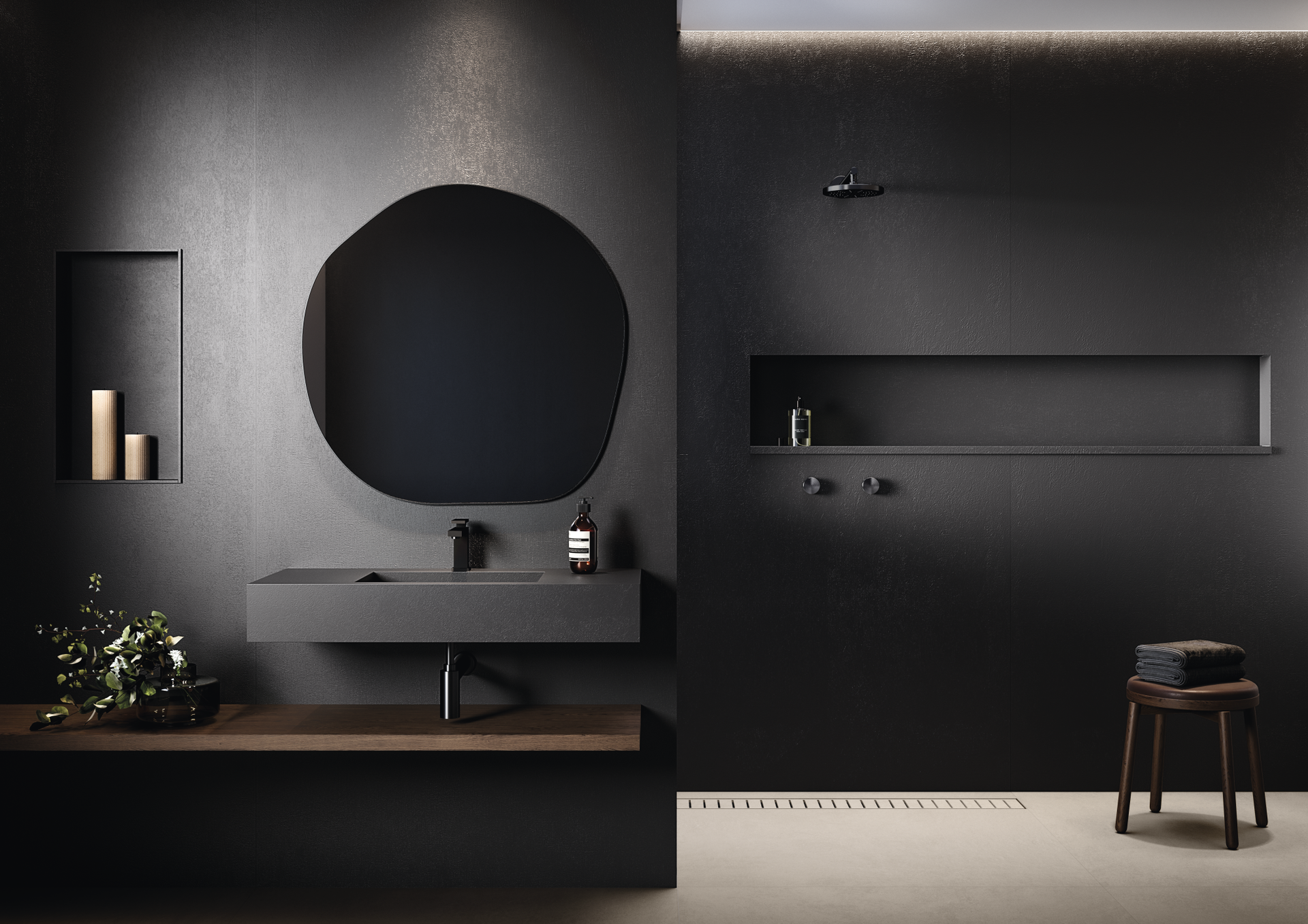The reproduction of a minimalist and almost single colored cement surface in warm tones translates the search for the essential and the comfort in living spaces.