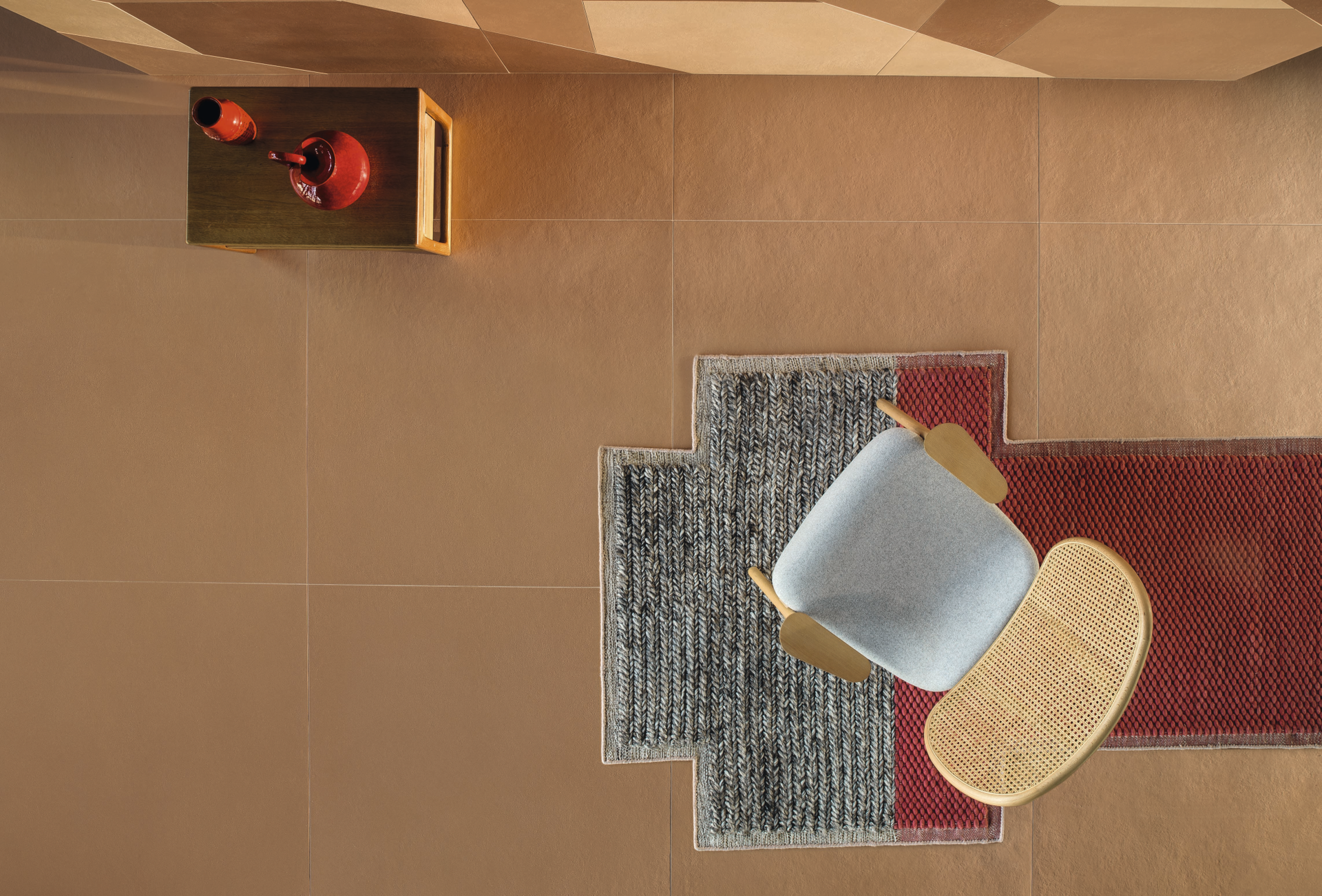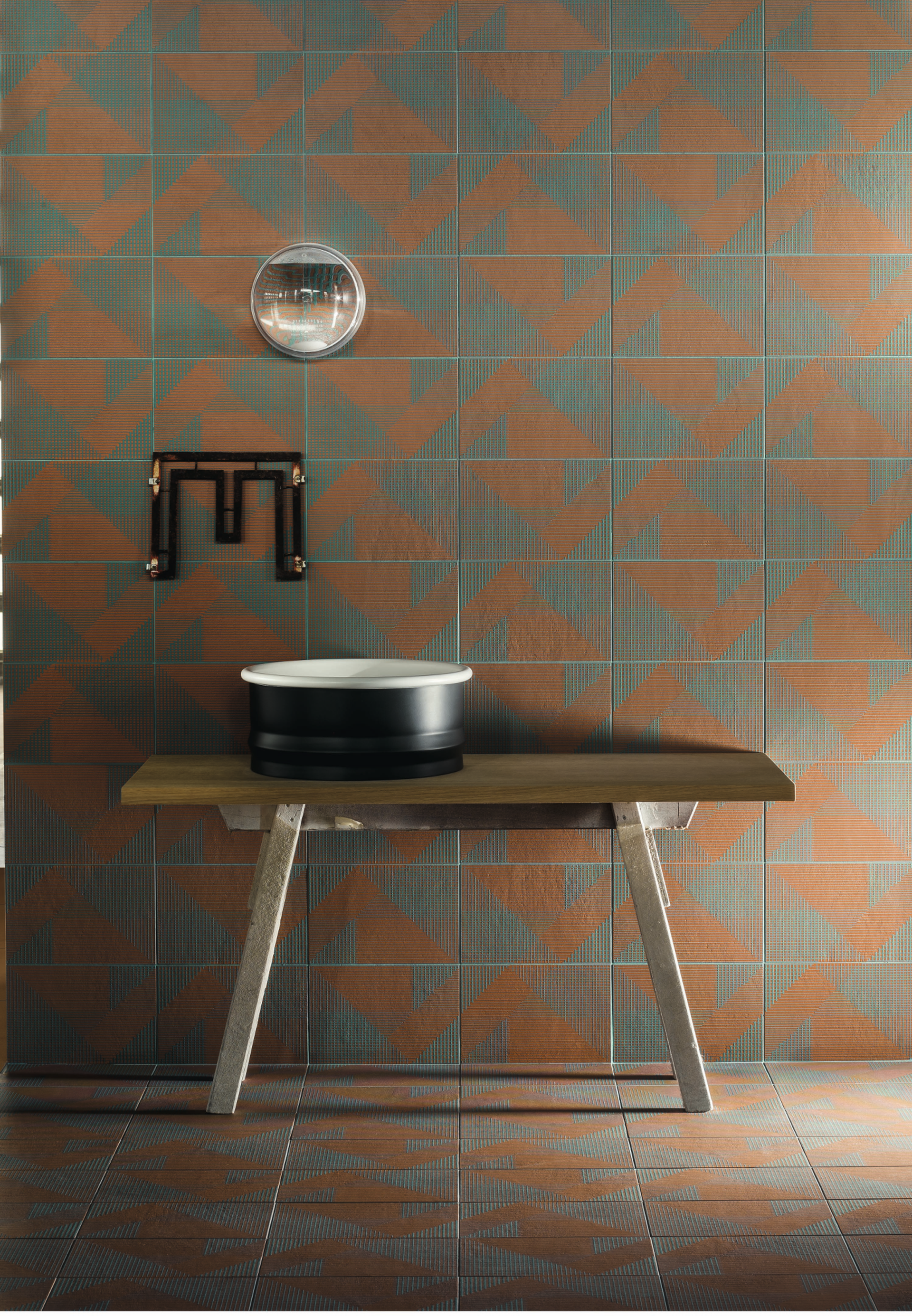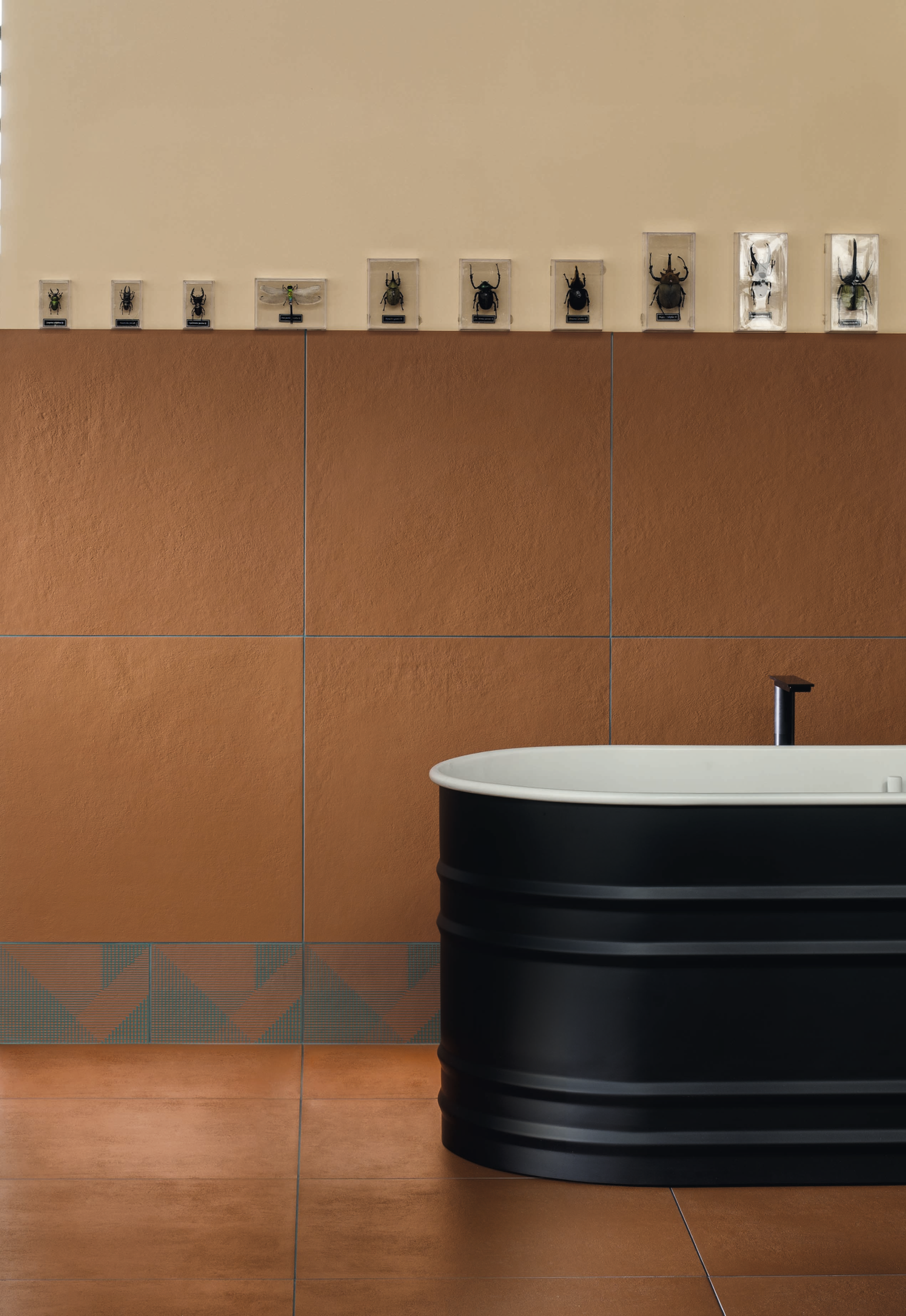 Realized in unglazed porcelain stoneware using the innovative Continua technology, which allows to work with dry powders, the tiles results extremely tactile and the color palette is characterized by natural yet rich and deep earthy shades, saturated by the black base underneath. These are combined with a series of putties in contrast with the previous nuances: an ironic interpretation of the joint that gives the environments a contemporary look.