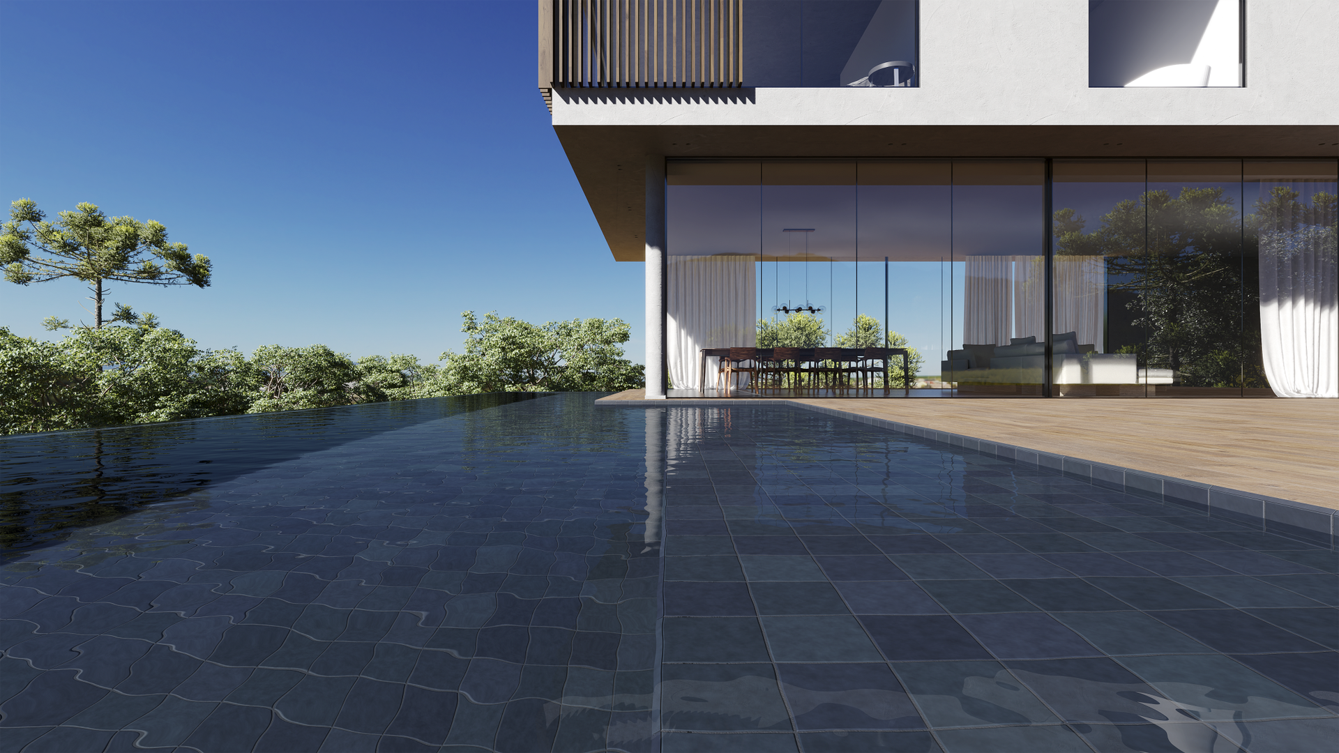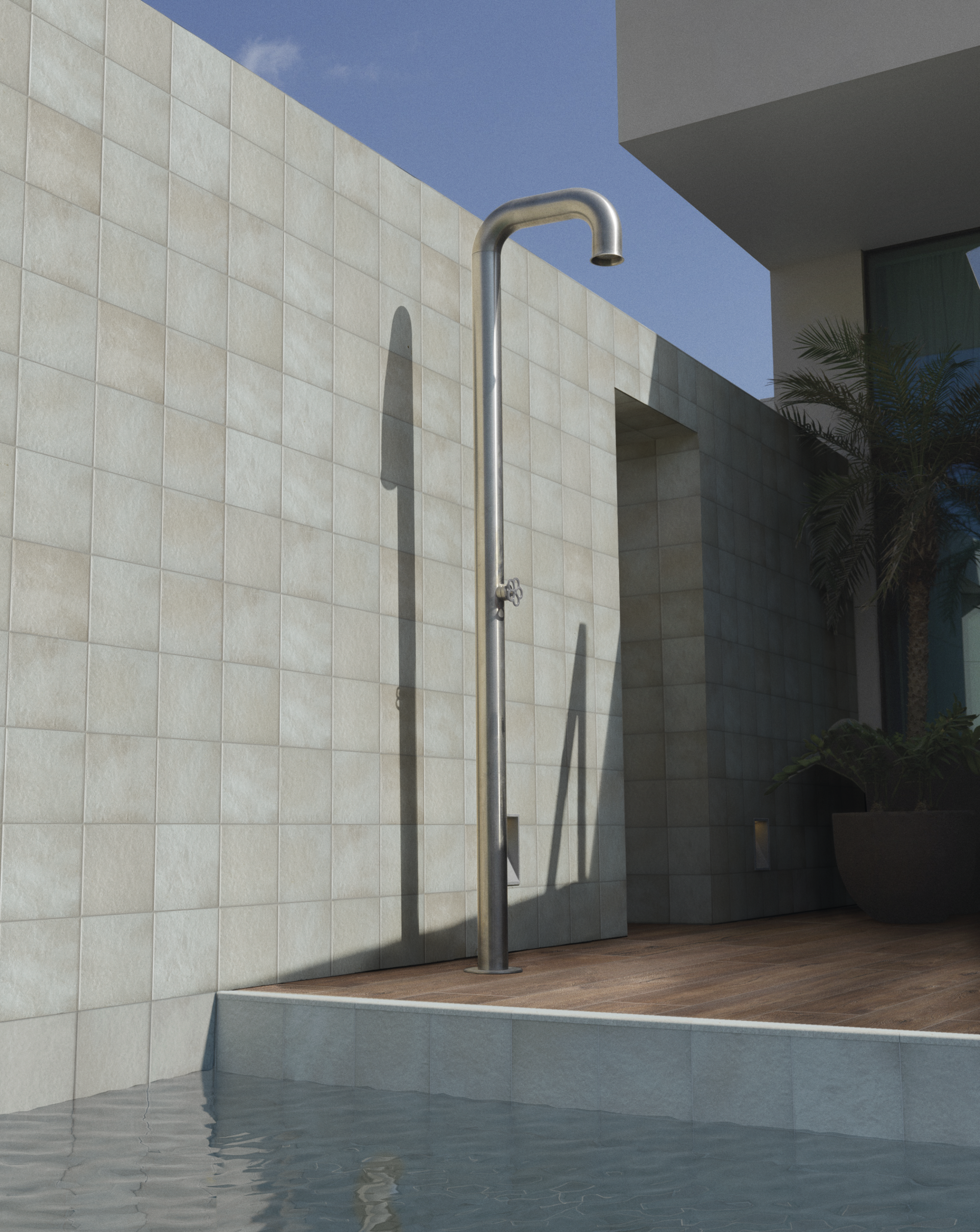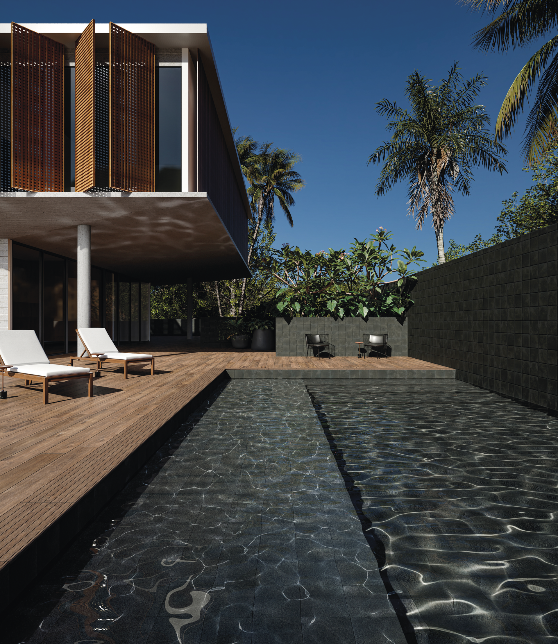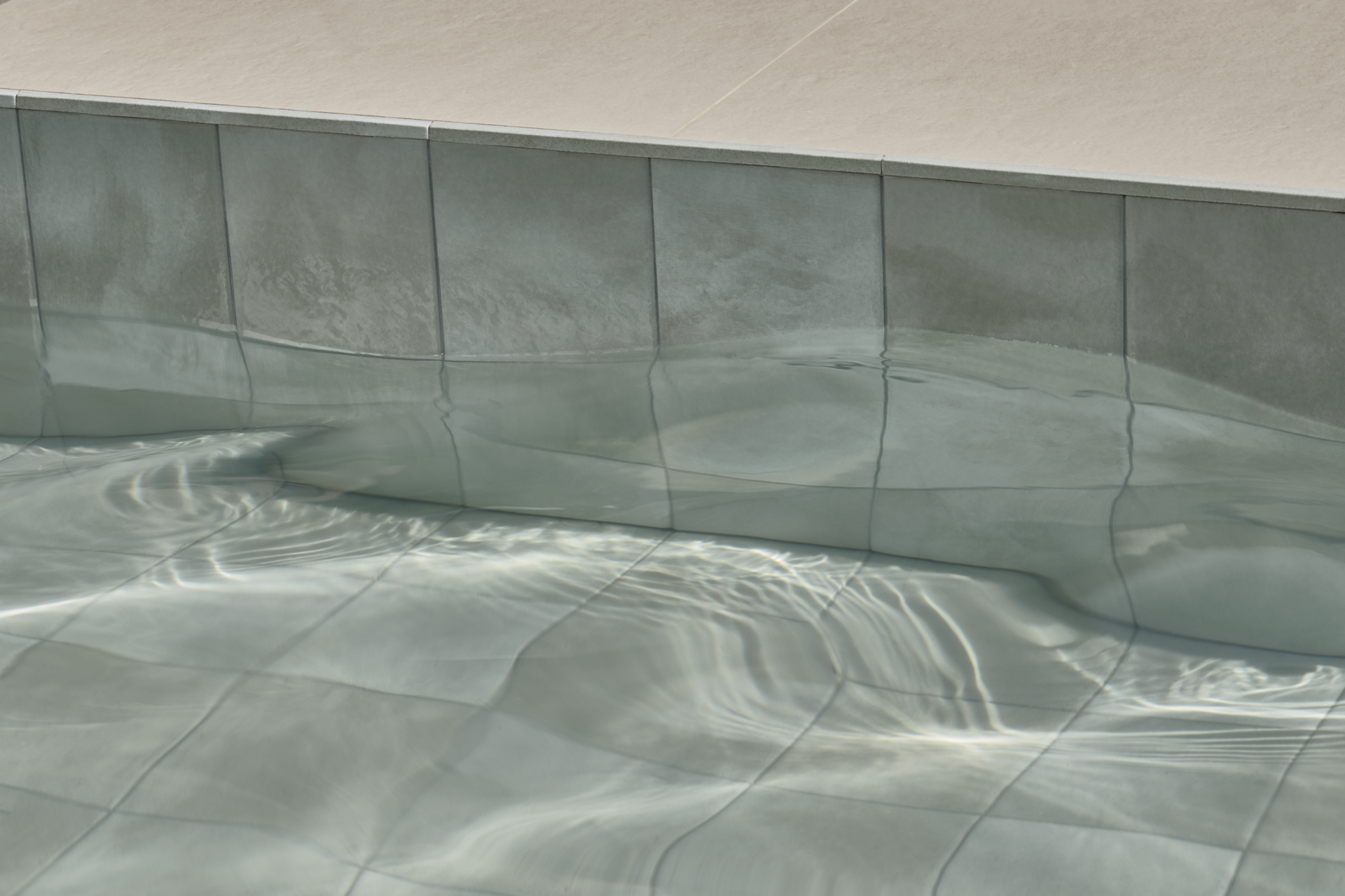 Sunset ofrece una superficie especialmente desarrollada para aplicar en piscinas. El movimiento del diseño y la variación de la tonalidad del producto se destacan al encontrarse con el agua y producen un efecto sorprendente.