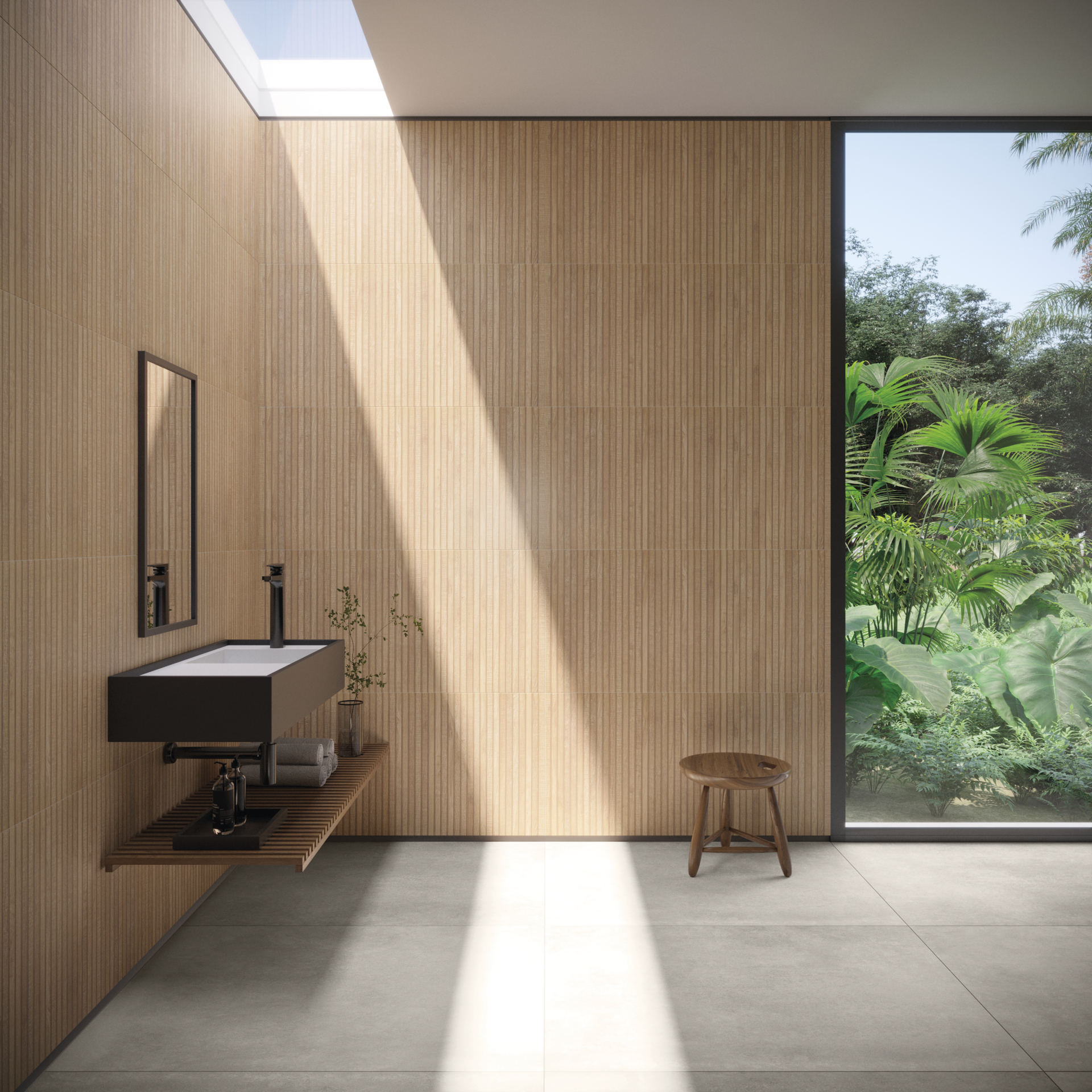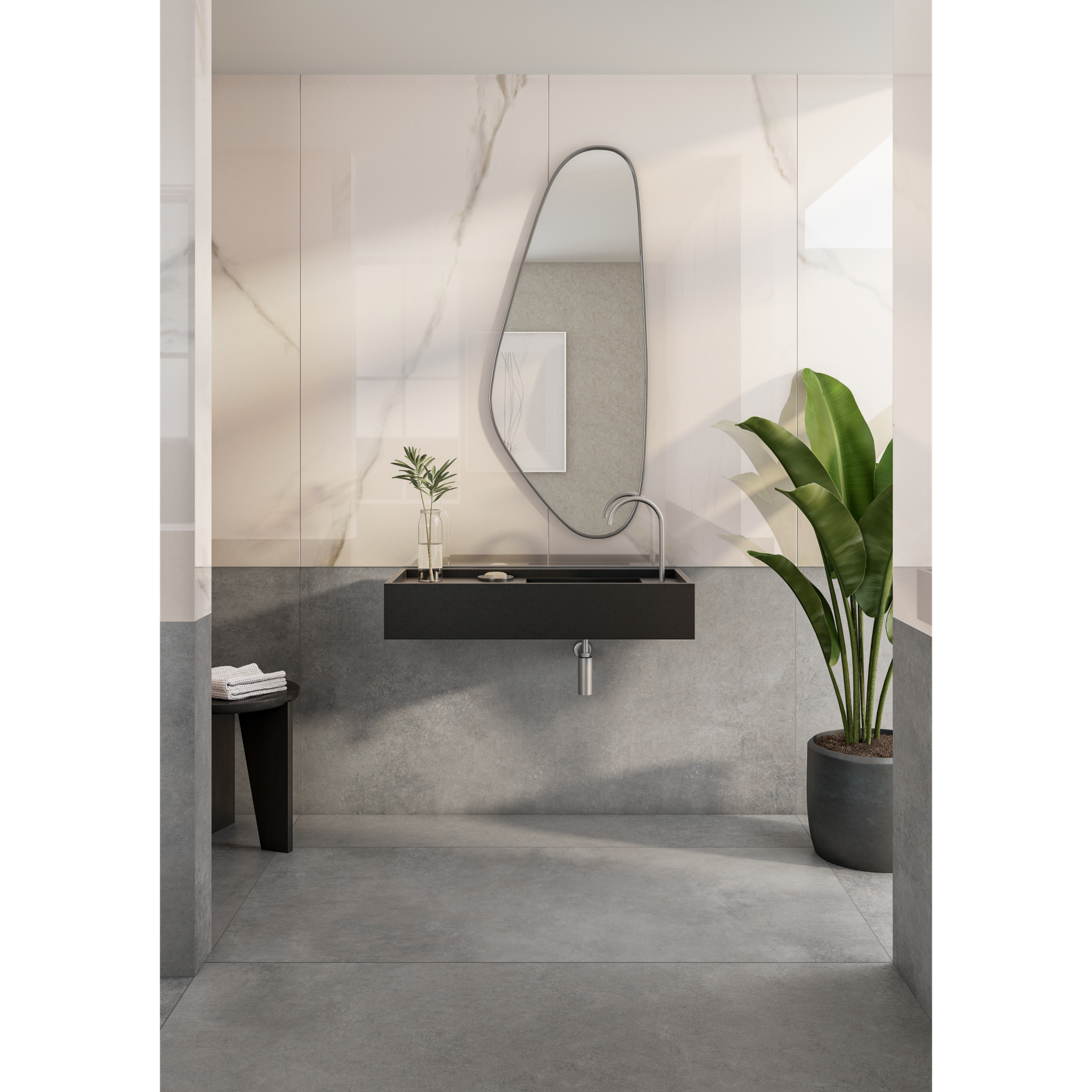 A possibilidade de compor dois materiais na mesma bancada evidencia a versatilidade de Reverse. Seja com cuba esculpida ou cuba de apoio, o resultado final revela a elegância da superfície do porcelanato em suas diversas faces.