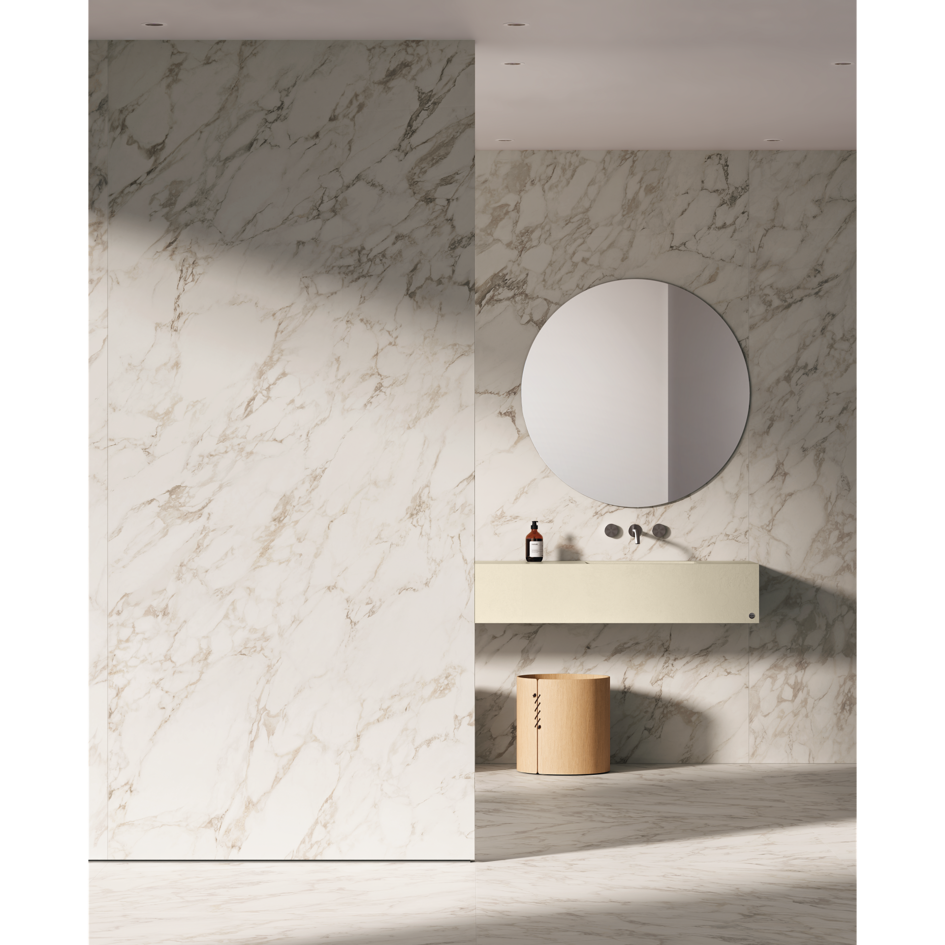 Uma matriz para personalizar através da escolha das superfícies e da composição dos diferentes blocos em porcelanato. Formas elegantes com acabamento de alta costura e sistema de fixação exclusivo.