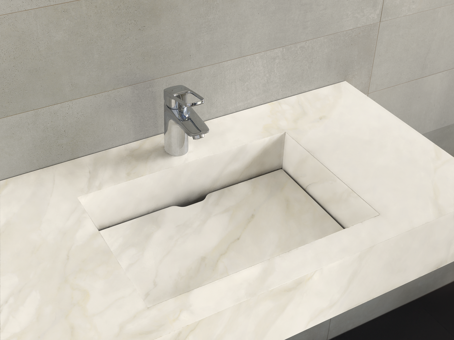 Blocos em porcelanato, criados a partir do conceito cuba-transição-apoio, compõem uma solução versátil de mobiliário para banheiros.